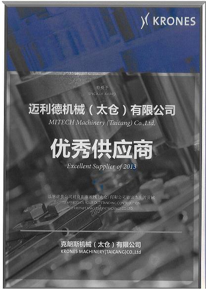 Be awarded as an excellent supplier of 2013 for KRONES